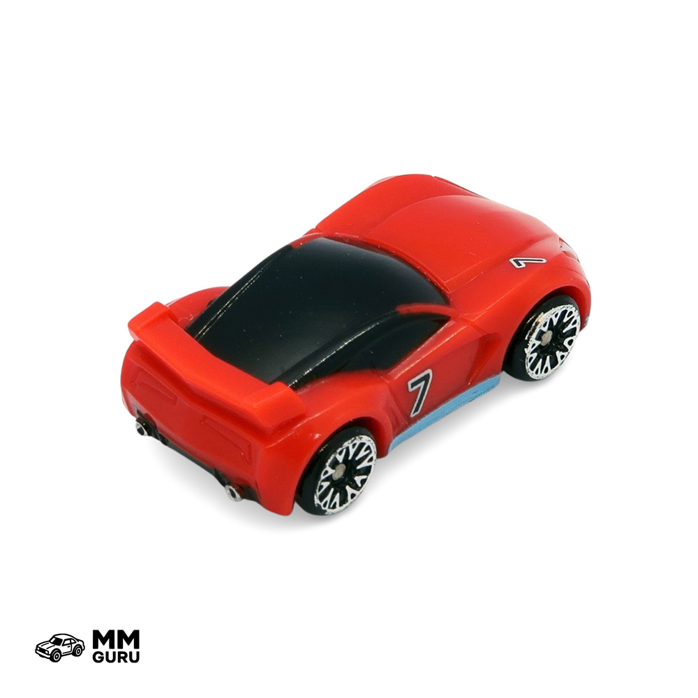 The GT-7 is a racing car with a long hood, a glass roof, a very compact rear topped by a spoiler. This model has the same red and blue livery as the trailer truck on which it can be placed to be transported from one circuit to another. On the hood and sides is the racing number 7. This model also exists in the RARE chrome silver variant and the ULTRA RARE chrome gold variant.