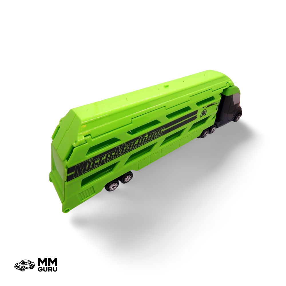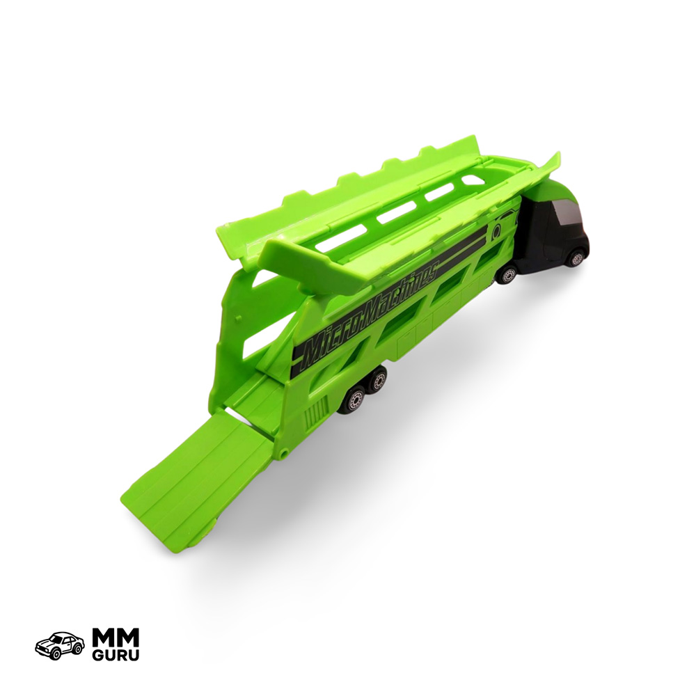 This car carrier has a green trailer and a dark gray tractor unit. The truck is a fantasy model with a futuristic style and can carry up to eight vehicles in its trailer. The rear ramp opens, and the internal ramp lowers to allow cars to drive in. The trailer can be detached from the tractor unit, although it doesn’t have a stand. The roof also opens in two sections so vehicles can be guided all the way down the ramp.