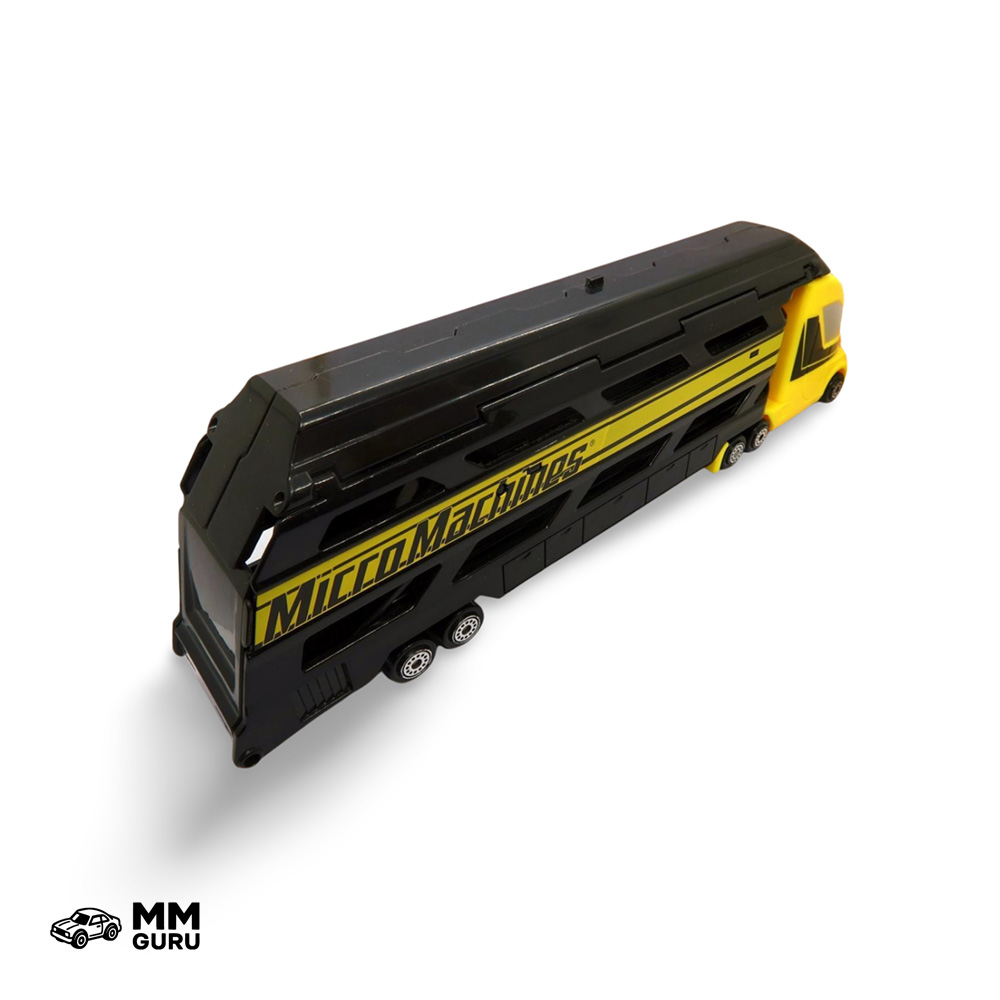 This car carrier has a black trailer and a yellow tractor unit. The truck is a fantasy model with a futuristic style and can carry up to eight vehicles in its trailer. The rear ramp opens, and the internal ramp lowers to allow cars to drive in. The trailer can be detached from the tractor unit, although it doesn’t have a stand. The roof also opens in two sections so vehicles can be guided all the way down the ramp.