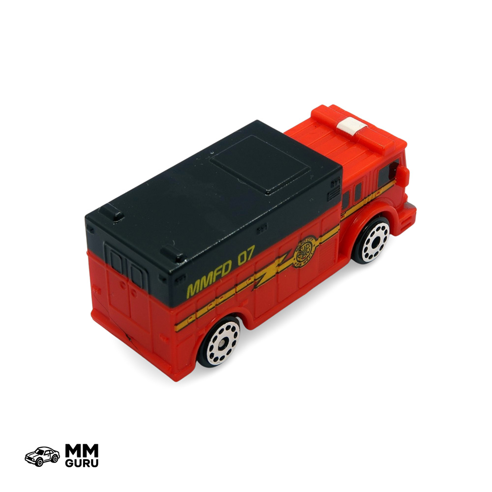 The heavy duty truck is a large, boxy fire engine. Painted red with a black roof on the rear compartment, it carries firefighters and their equipment to the emergency site. Micro Machines Fire Department 07 is the unit it belongs to.