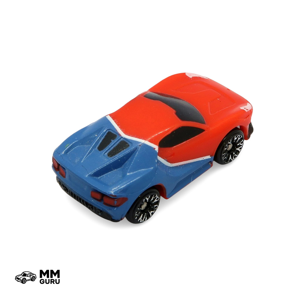 The Canebrake is a sports car distinguished by its large air intakes ahead of the rear wheels and its small rear window split into two sections. This model is red and blue, with a thin white stripe separating the two colors.