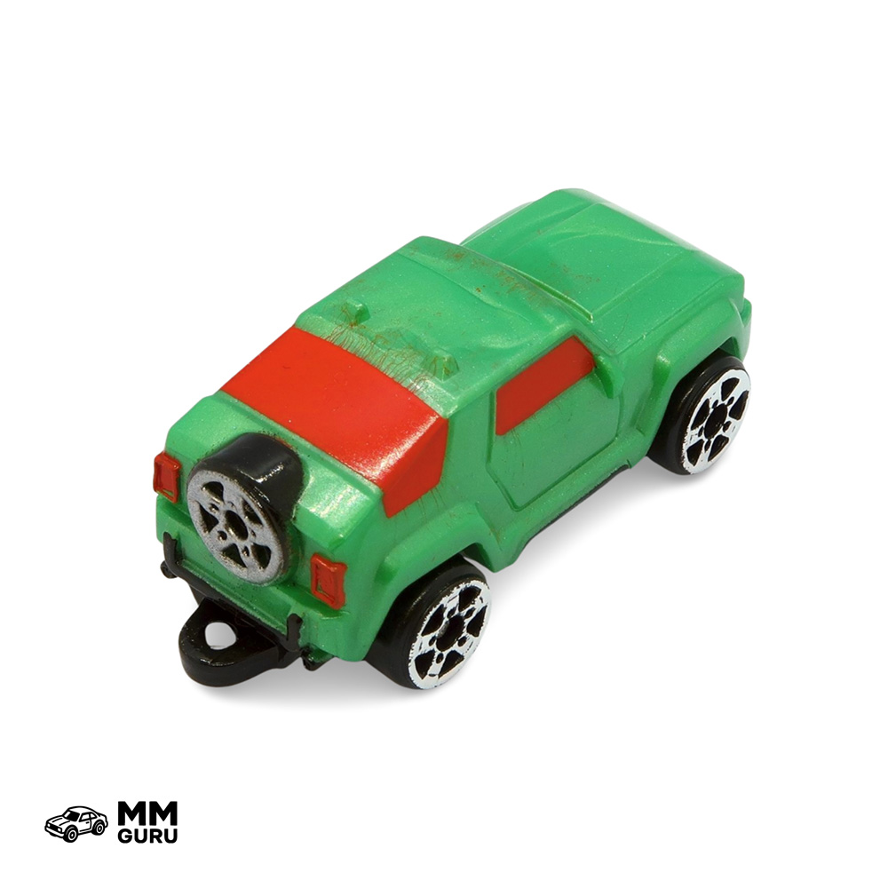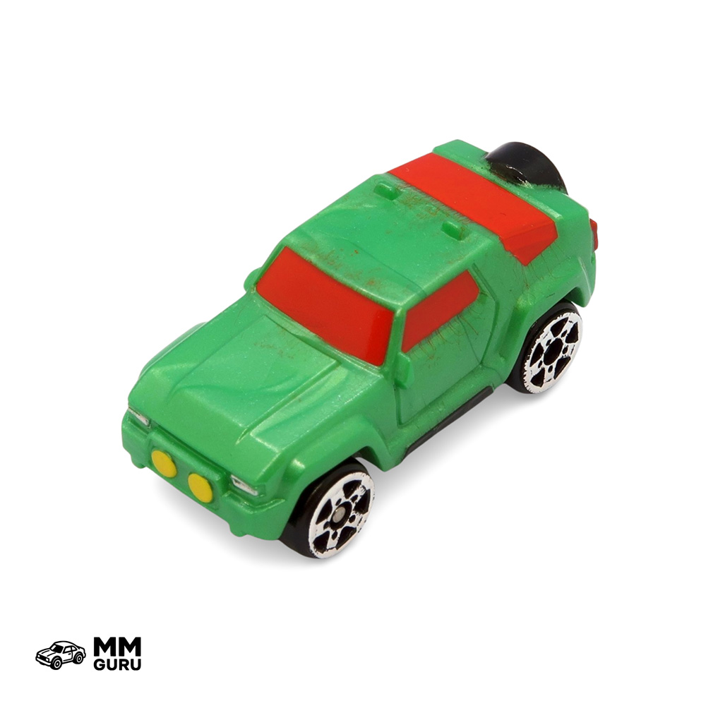 The Hognose is an off-road vehicle with a sharply slanted rear window and a spare wheel integrated into the tailgate. Its large front headlights and tow hook make it a leisure vehicle meant for areas far from paved roads. This Hognose is green with red windows. It could be found in the Stunt Pack Starter Pack, 2020. It is found exclusively in the third of the three Christmas Candy Cane sets sold at Target stores in the USA during Christmas 2020.