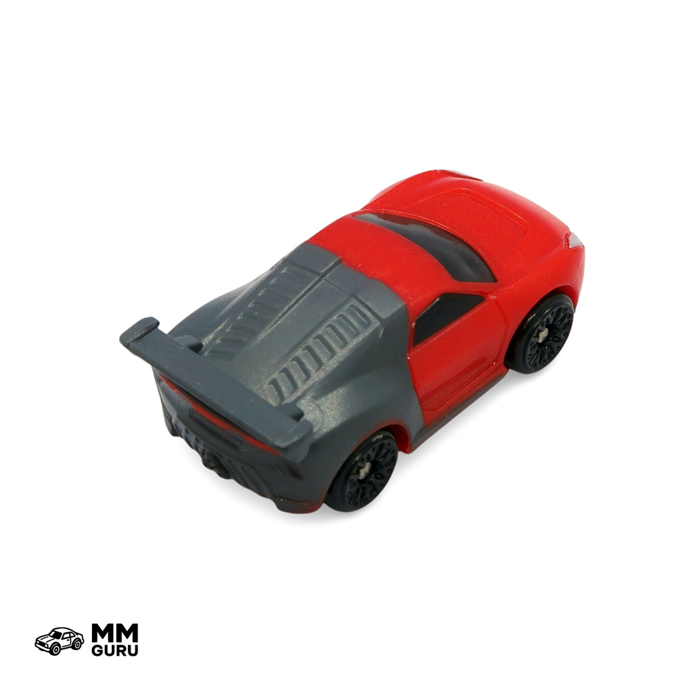 The Bezel is a sleek supercar with clean lines and a rear wing. The vents on the rear window suggest a mid-mounted engine. This one is half red and half grey, the outlaw car in the Micro Police Chase set.