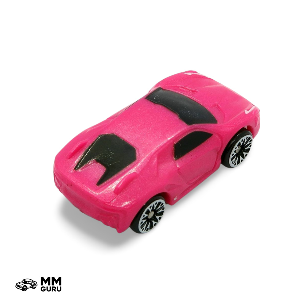 The Paso Fino is a sports coupé, likely with a mid-engine layout and possibly inspired by the Ferrari 458 Italia, given its overall shape and the design of the headlights. A distinctive feature is the pair of small rear fins. This example comes in pink; it could be found in the World Pack 10, Super Cars, released in 2021.