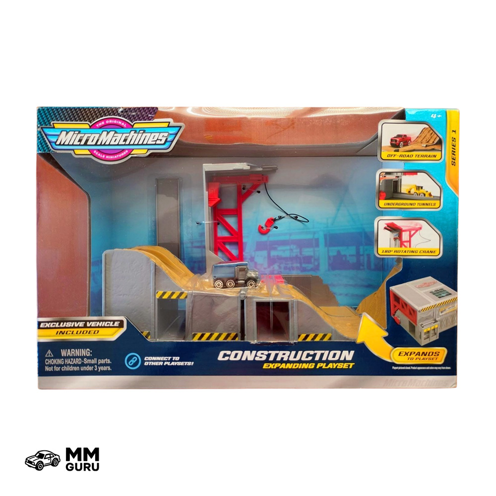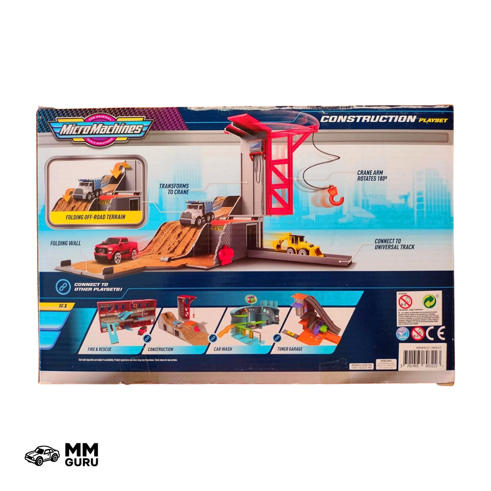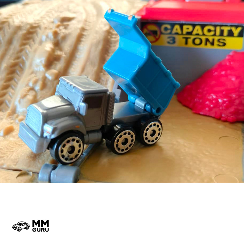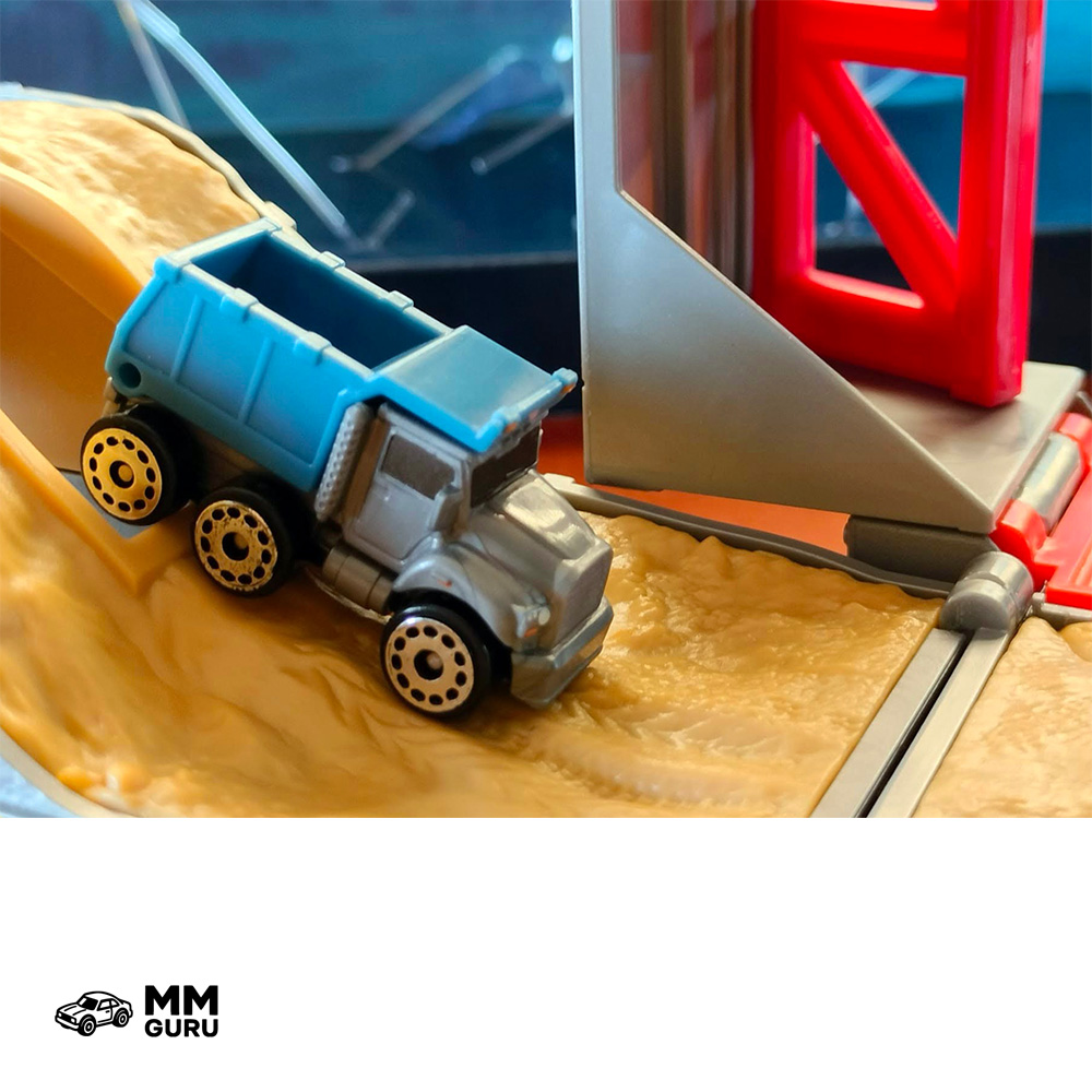 This playset opens to reveal a construction site with a couple of dirt ramps, two tunnels, and a tilting crane with a hook held by a short cord. The overall build quality is quite low: the cable is too stiff and doesn’t stay straight, and it’s unclear what the hook is even supposed to be used for. The ramps have a nice texture, but the slopes are obviously exaggerated. The stickers were applied carelessly, as they’re rather crooked. The included vehicle is a gray Dump Truck with a blue bed. Download PDF instructions