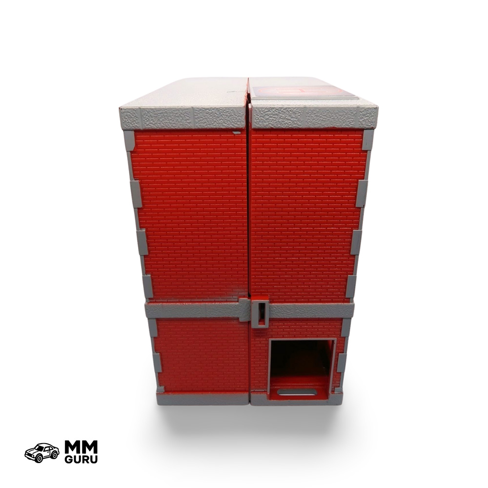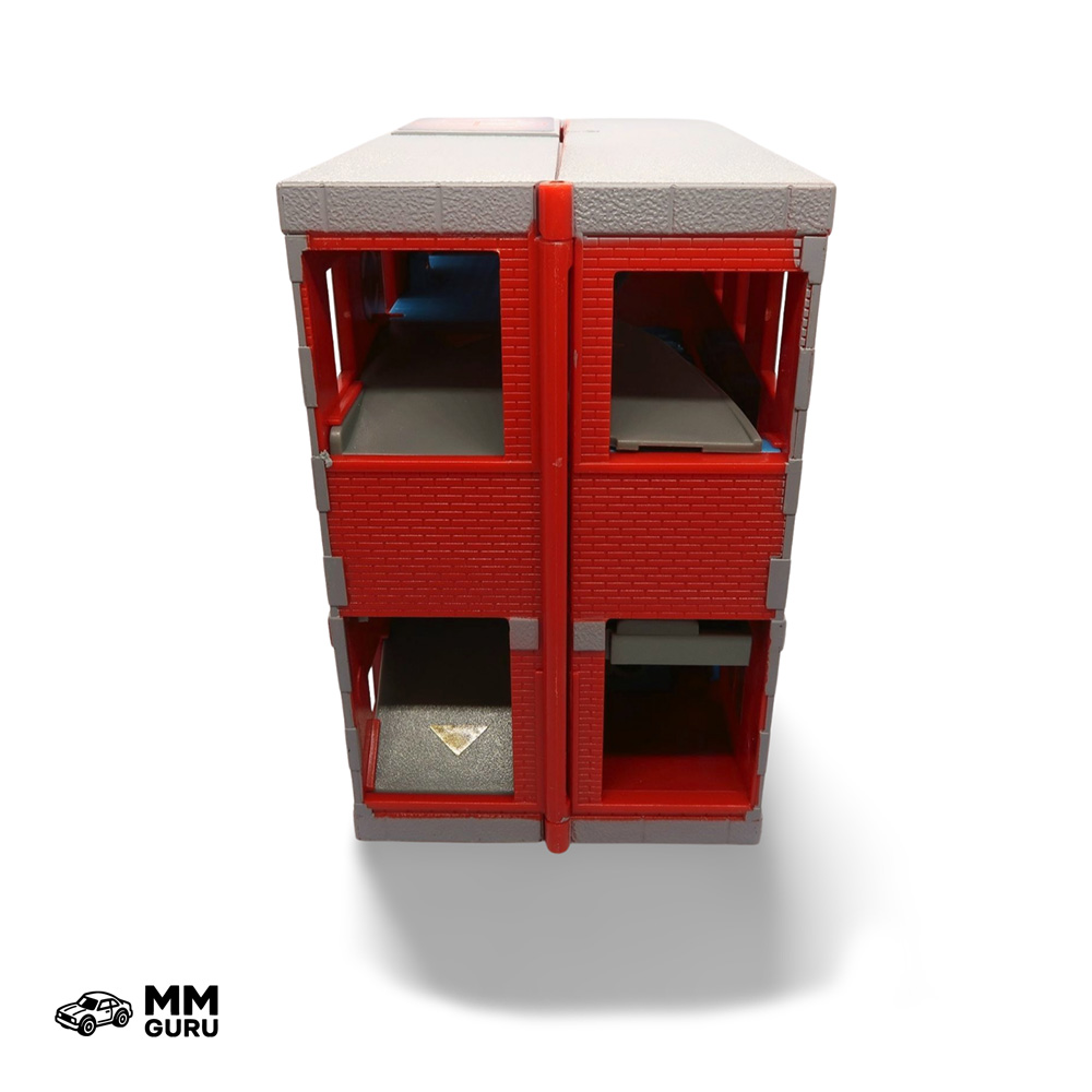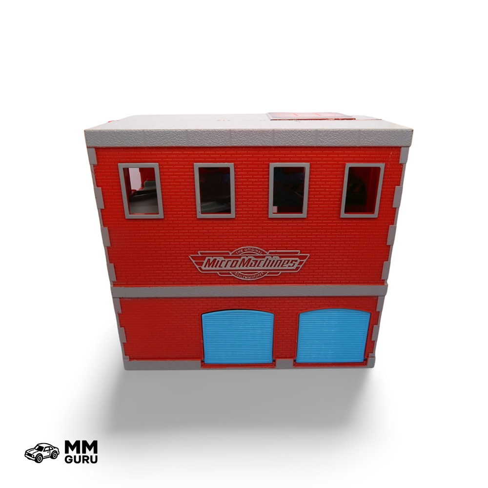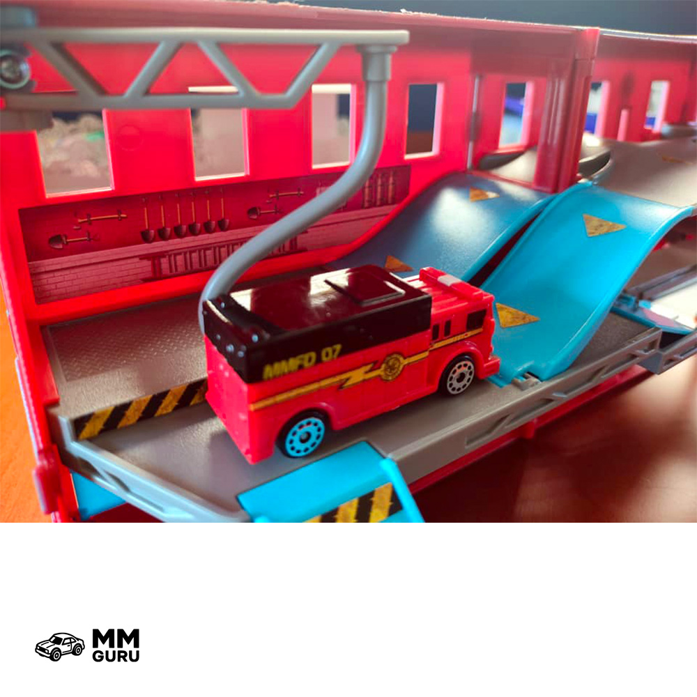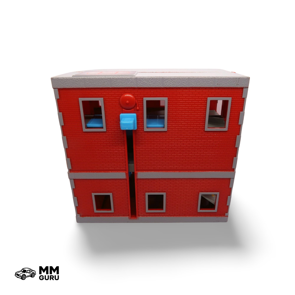 This playset is a fire station that opens up and contains several ramps for driving the truck inside. The interior walls are decorated with stickers, there is a movable arm with a hose to supply water to the fire engines and an elevator. On the outside, the building has a brick-like texture and two shutters that can be opened. A straight road piece is included, allowing the playset to connect with others in the same series. The included vehicle is the red Heavy Duty Truck with a black roof. Download PDF instructions