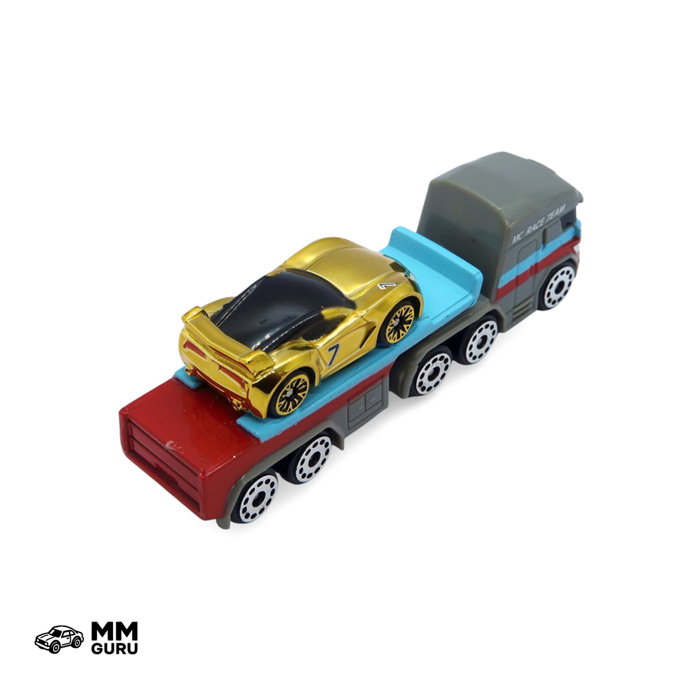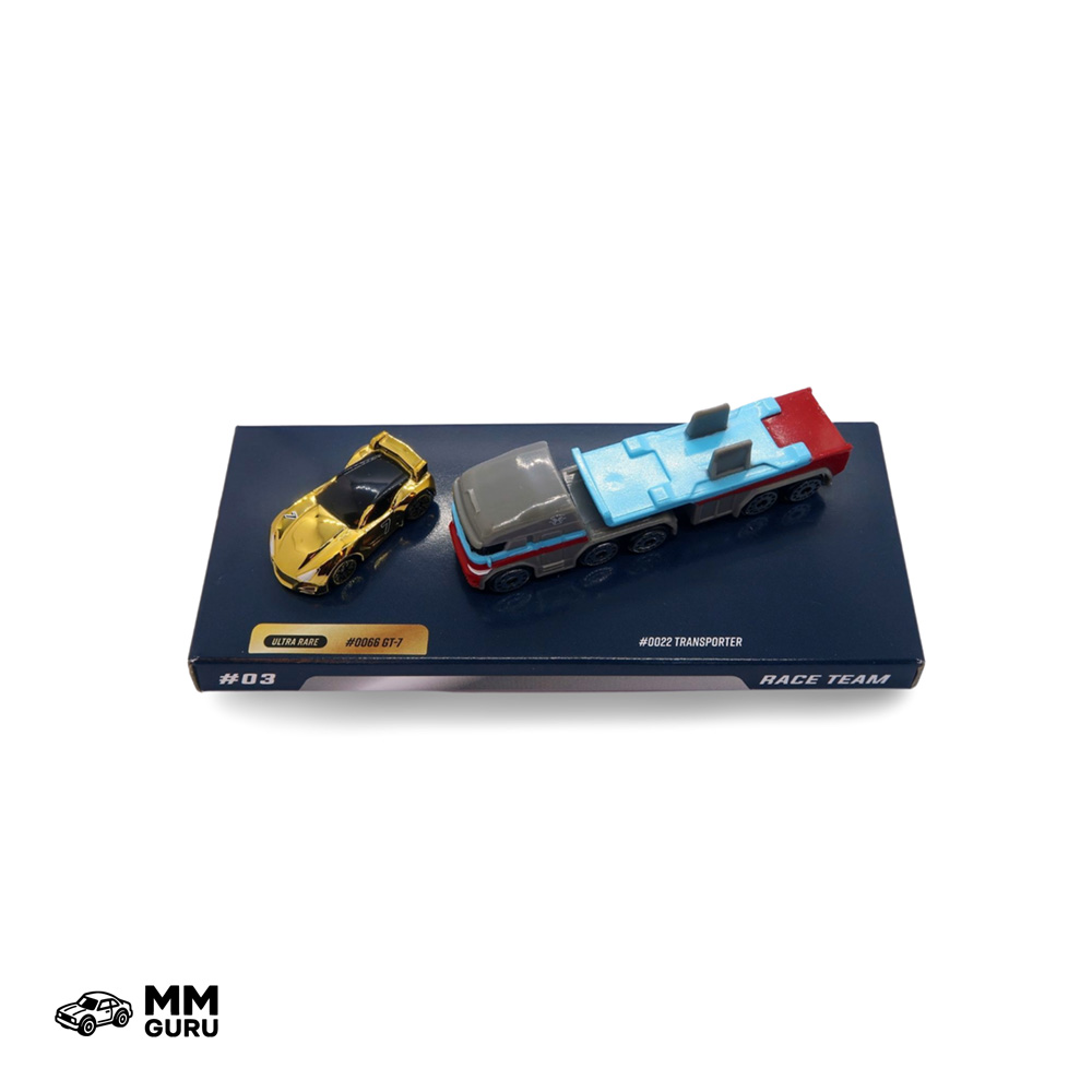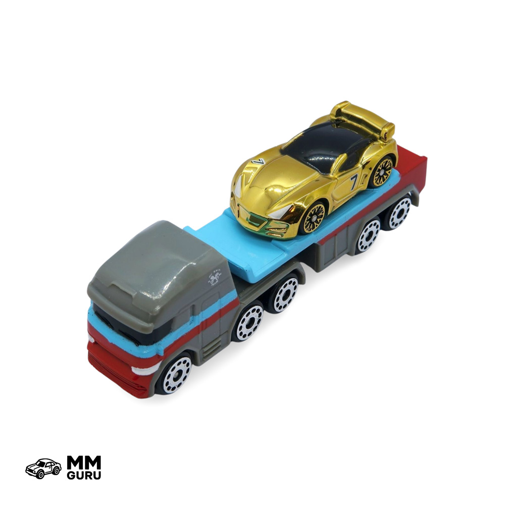 Third starter pack from Series 1 (2020), this set includes a flatbed semi truck and a gold chromed chase vehicle. This set has a variant in which the GT-7 has silver rims instead of gold ones.