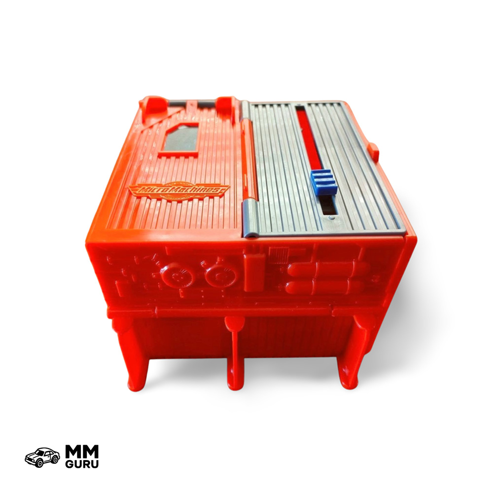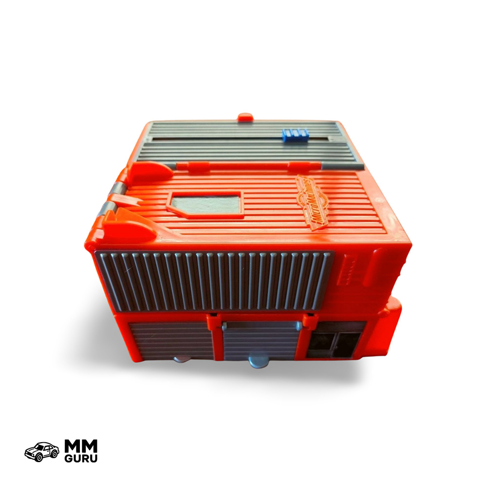 This playset isn’t easy to open; the latches are really stiff. Once opened, the playset is basically a long slide that unfolds with a finish line at the end, where two Micro Machines cars can race. To reach the start of the track there’s an elevator, accessed via a climb with an absurdly steep slope. At the base of the playset there’s a roller bed and a workshop lift that raises for mechanical work, although without the central opening it’s unclear what it’s supposed to be used for. The vehicle included in this playset is a yellow Felis with black details. Download PDF instructions