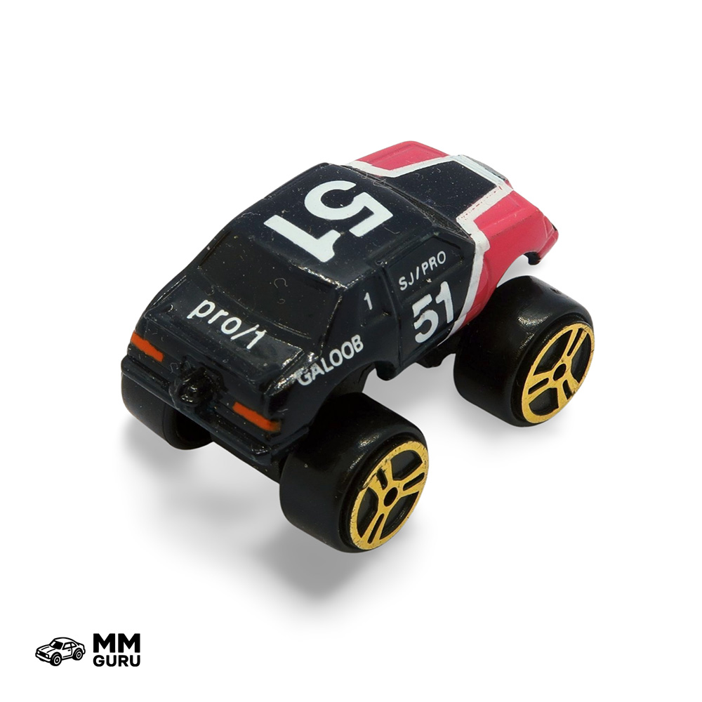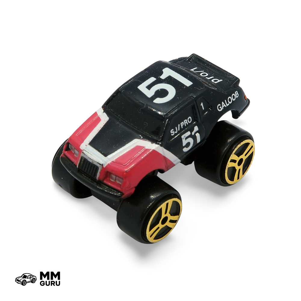 The Pontiac Grand Prix Stock Car is a classic racing vehicle known for its powerful engine and sleek design. Built for speed and performance on the track, it features a low, aerodynamic body and a robust chassis that handles high-speed corners with precision. Favored by stock car enthusiasts, this model combines style and raw racing capability, making it a standout in any race. In this set, the car is presented with a raised chassis to accommodate the large wheels typical of the Turbo Wheels models.